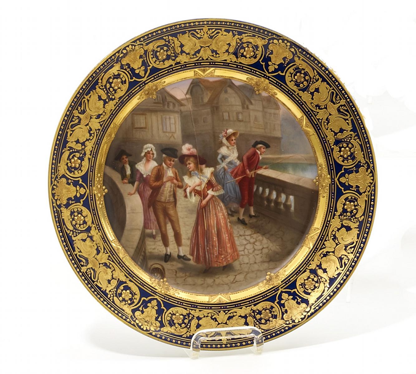 Porzellan, farbig und gold staffiert. Fahne mit floraler und geometrischer Reliefvergoldung. Im Spiegel feine Darstellung