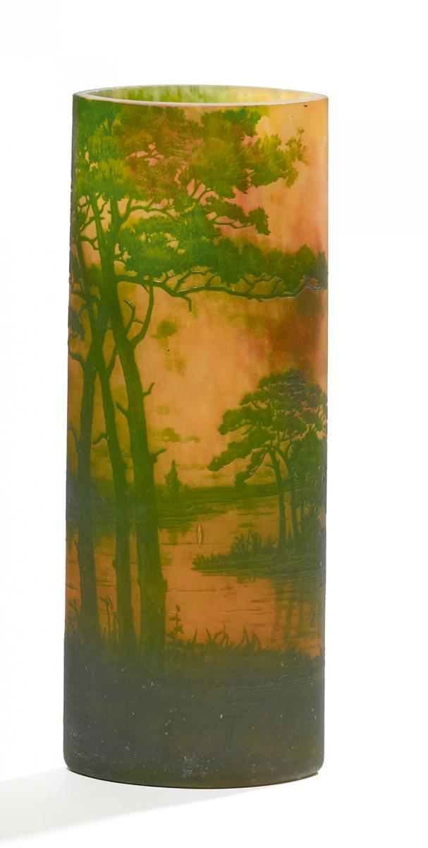 Farbloses Glas, milchig weiß hinterfangen. Flockig Grün, Gelb und Rot hinterfangen. Überfang in Grün. Mattgeätzt. Seenlandschaft im Abendrot. Höhe 30,5cm. Zustand B/C.