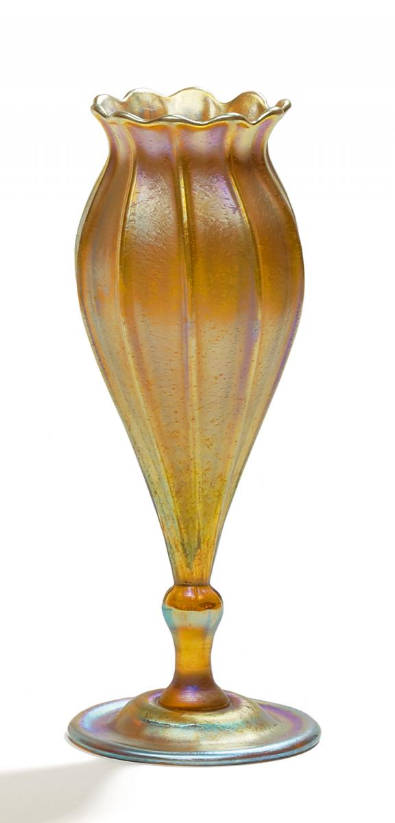Mehrfarbig irisierendes Glas, sog. Favrile-Glas. Über rundem Standfuß sich nach oben öffnender blumenartiger gerippter Korpus. Höhe 18cm. Zustand A/B.