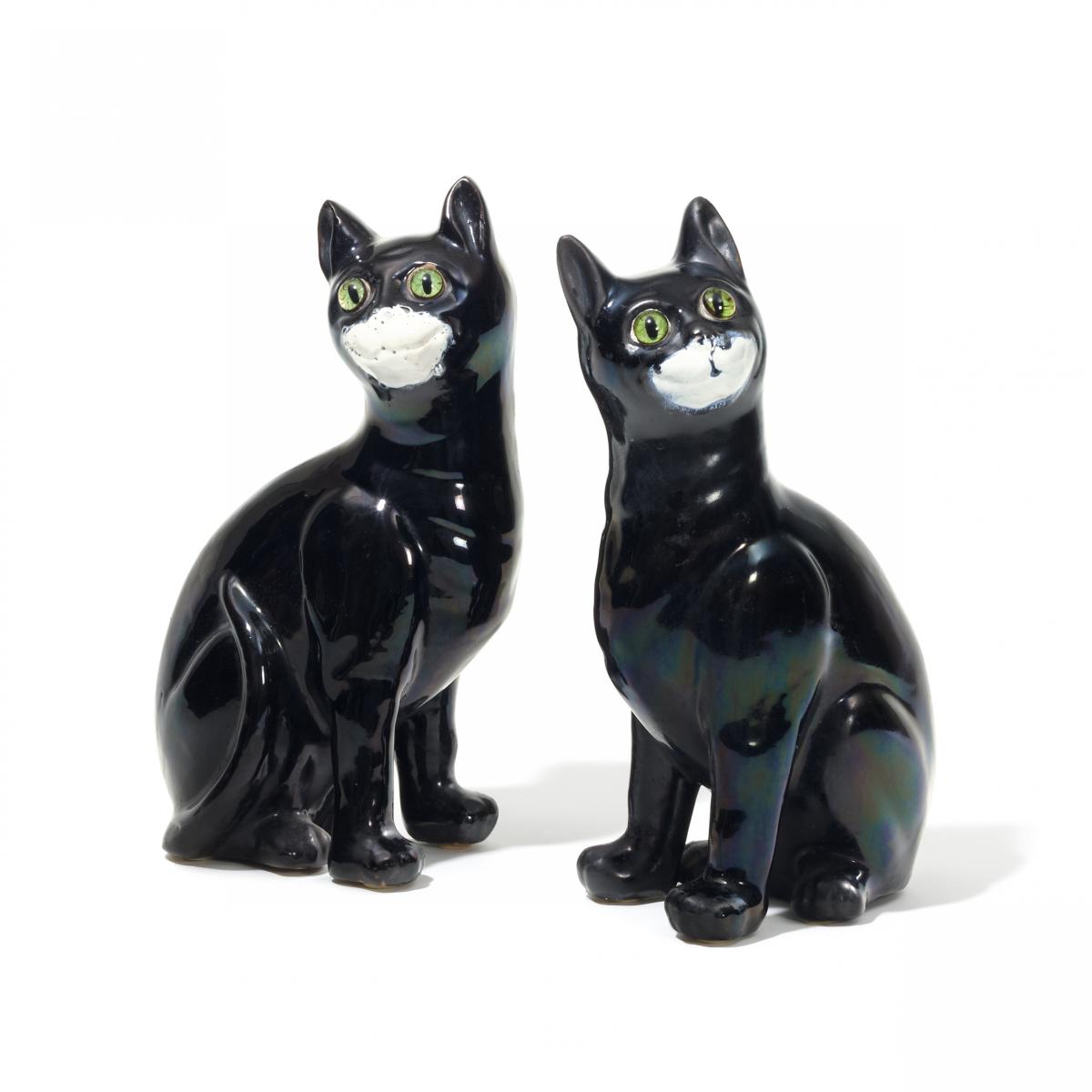 Rötlicher Scherben, leicht irisierend schwarz und weiß glasiert. Grüne Glasaugen. Höhe 33,5cm. Zustand C.