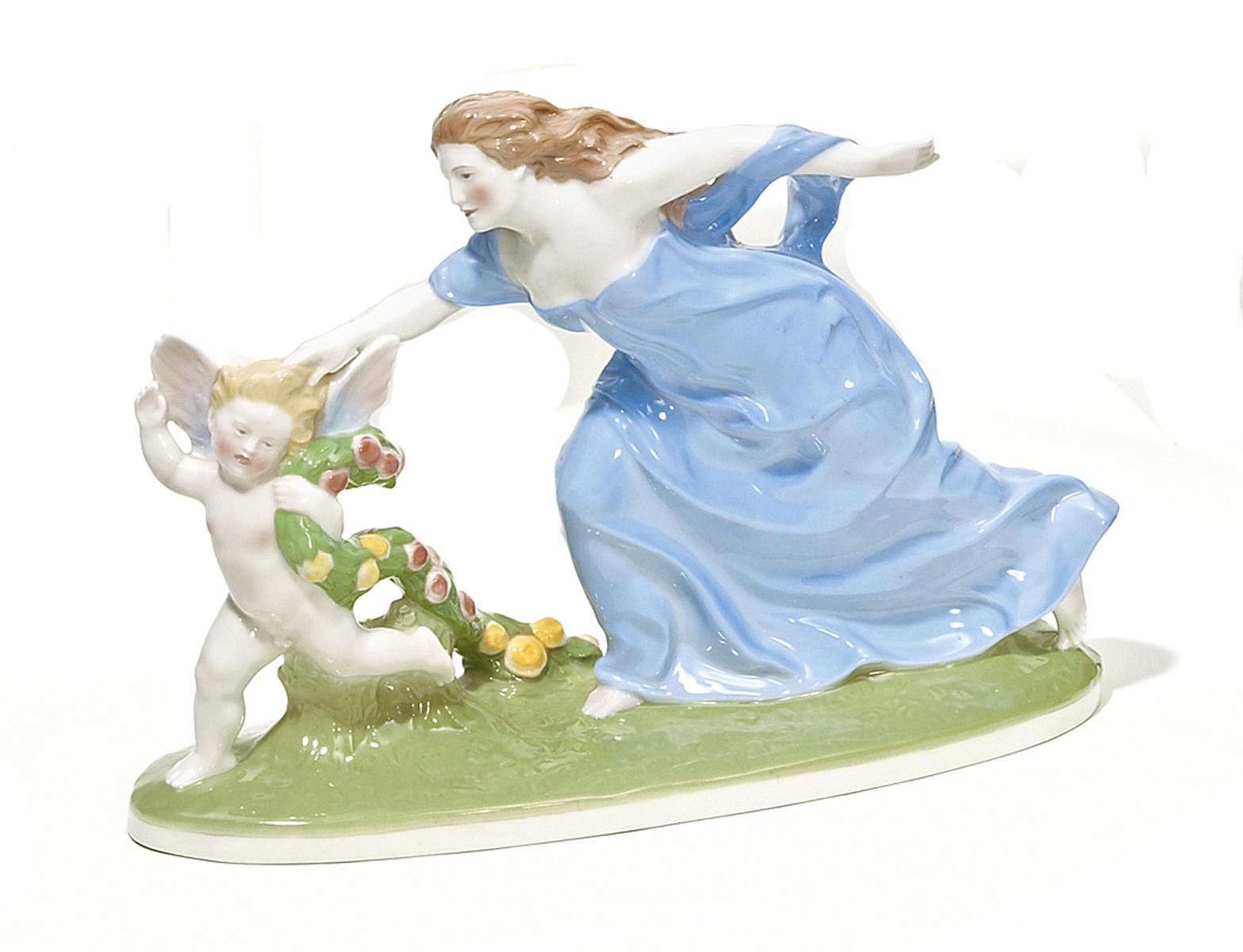 Porzellan, farbiges Unterglasurdekor. Höhe 21cm. Zustand A. Auf Sockel bez. 'H. Schwegerle 1912'.