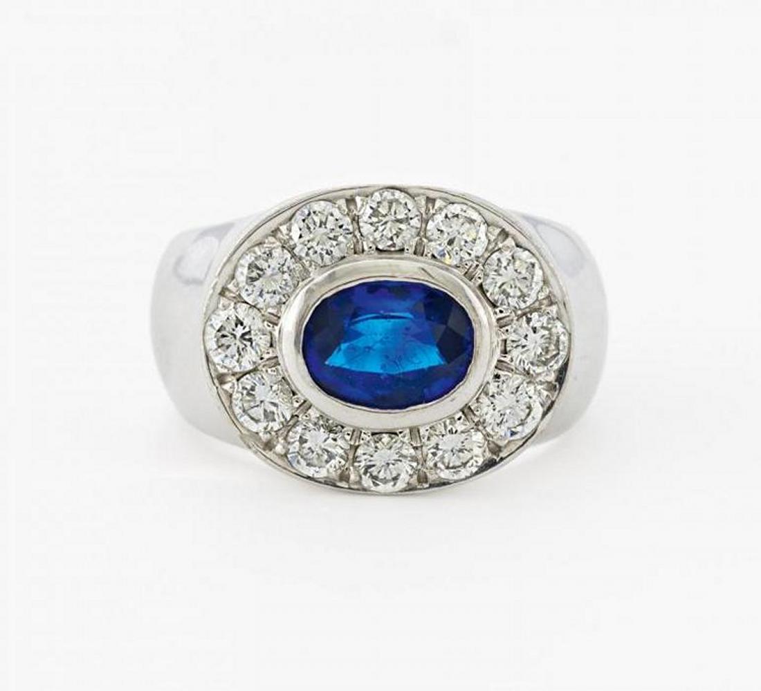 750/- Weißgold, Gewicht: 19,7g. 1 oval facettierter Saphir ca. 1,14ct, 12 Brillanten zus.ca. 1,176ct TW(F-G) VVS, EU-RM: 52.