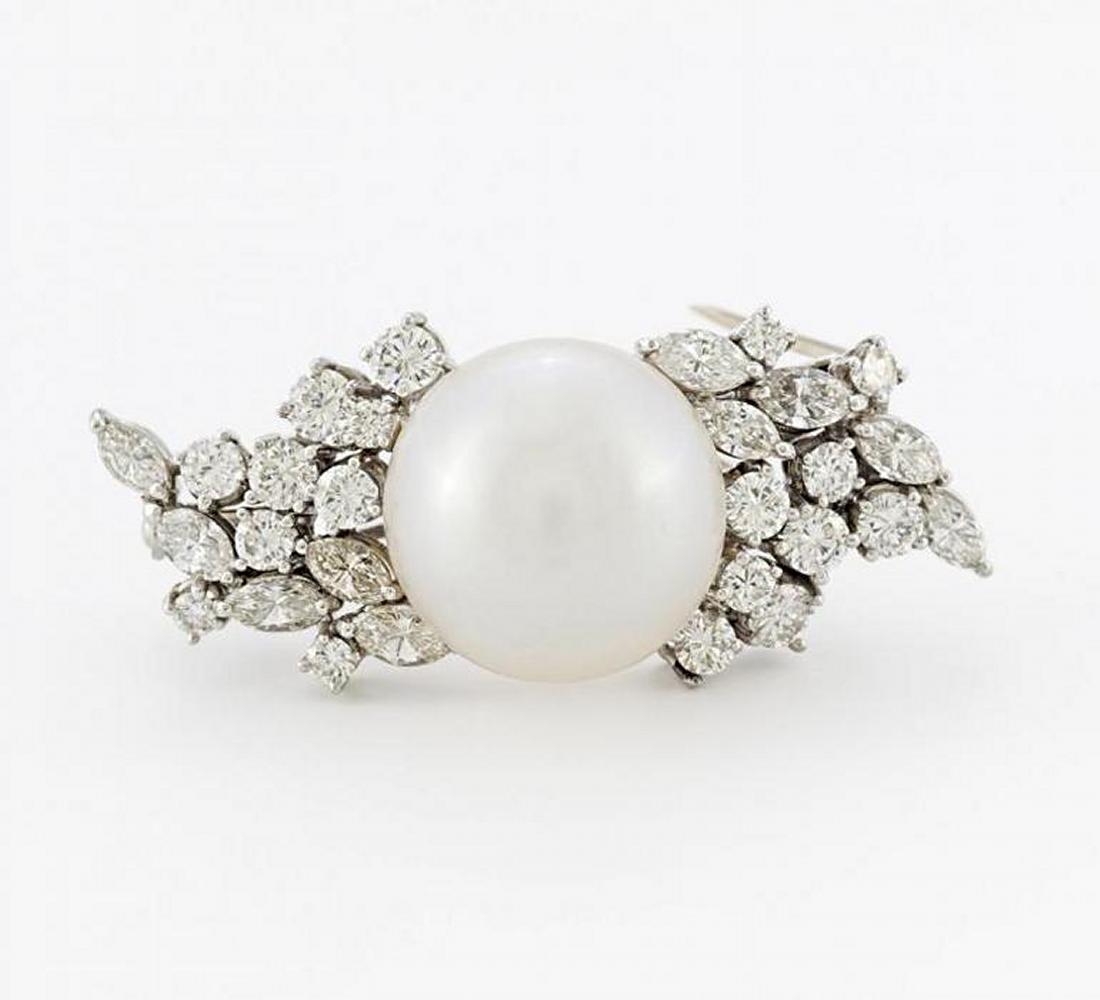 Cocktailbrosche mit Zuchtperl-Diamantbesatz.