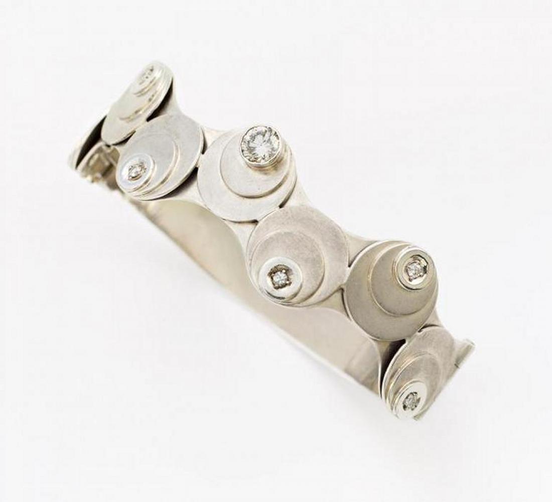 585/- Weißgold, Gewicht: 38,8g. Mittlerer Brillant ca. 0,622ct W(H) VVS1, 6 Diamanten zus.ca. 0,168ct W(H) VVS, D.ca. 6,0cm. Innseitig gestempelt "gb".