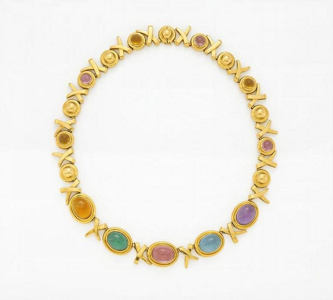 750/- Gelbgold, Gewicht: 115,3g. 3 runde gelbe Topase D.ca. 7,31mm, 3 runde rosafarbene Turmaline D.ca. 7,38mm, 1 ovaler gelber Topas D.ca. 15,71 x 11,73mm, 1 ovaler blau-grüner Turmalin D.ca. 15,17 x 11,44mm, 1 ovaler rosefarbener Turmalin D.ca. 15,69 x 11,45mm, 1 ovaler Blautopas D.ca. 15,58 x 11,81mm, 1 ovaler Amethyst D.ca. 15,30 x 11,49mm, L x B=ca. 44,5 x 1,2-1,7cm. Aus der Kollektion Paloma Picasso, sign. Tiffany & Co.