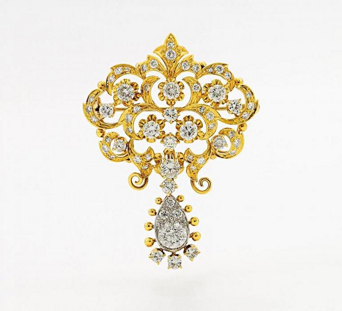 750/- Gelb-/Weißgold, Gewicht: 11,4g. 38 8/8-Diamanten, 19 Brillanten zus.ca. 1,938ct W-TCr(H-I) VVS-SI, 1 Brillant ca. 0,787ct TCr(I) P1, H x B=4,7 x 3,5cm. Untere Pendile aushängbar.