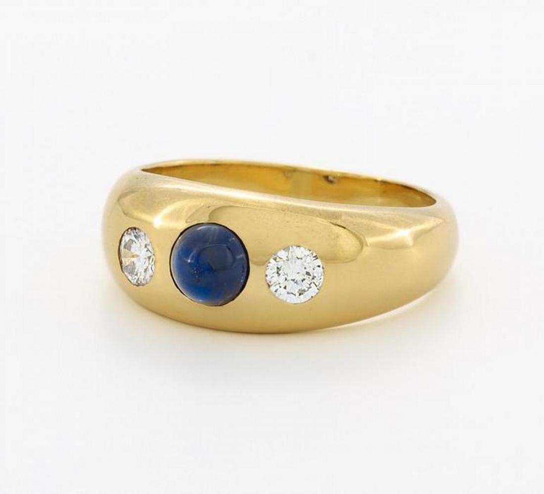 585/- Gelbgold, Gewicht: 11,4g. 1 runder Saphir-Cabochon ca. 0,80ct, 2 Brillanten zus.ca. 0,40ct TW(G) SI, 63,5.
