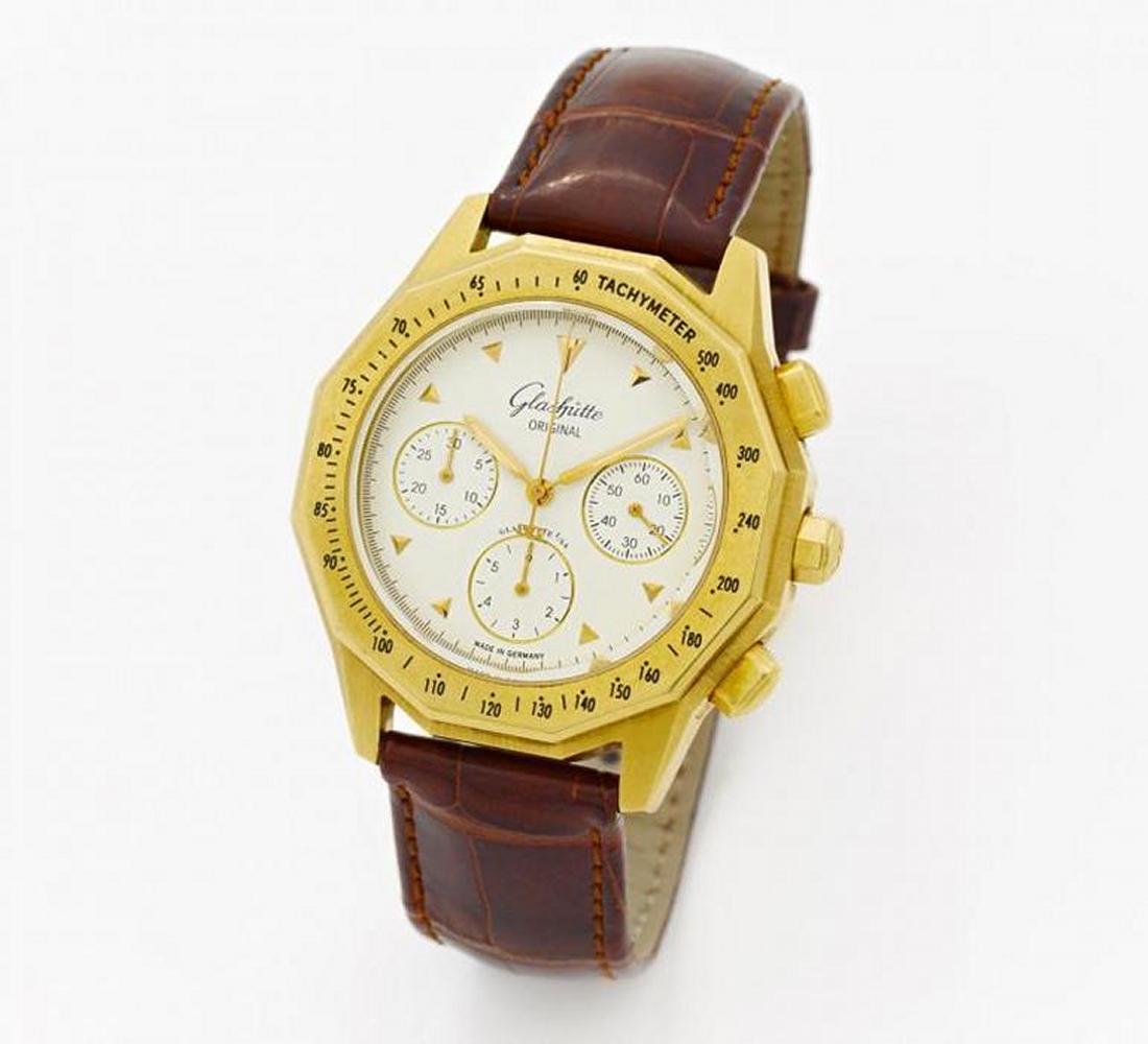 Sport Chronograph. Herrenarmbanduhr. Referenz-Nr.: 10-661304. Werk-Nr.: 203610. Gehäuse: 750/- Gelbgold, Lederarmband braun, Orig.-Dornschließe 750/- Gelbgold, Zffbl. weiß, Zeiger/Indizes golden, Automatik. Rückseitig nummeriert 0044, inkl. Rechnung vom 18.07.1997 und Holzbox. Herkunftsort