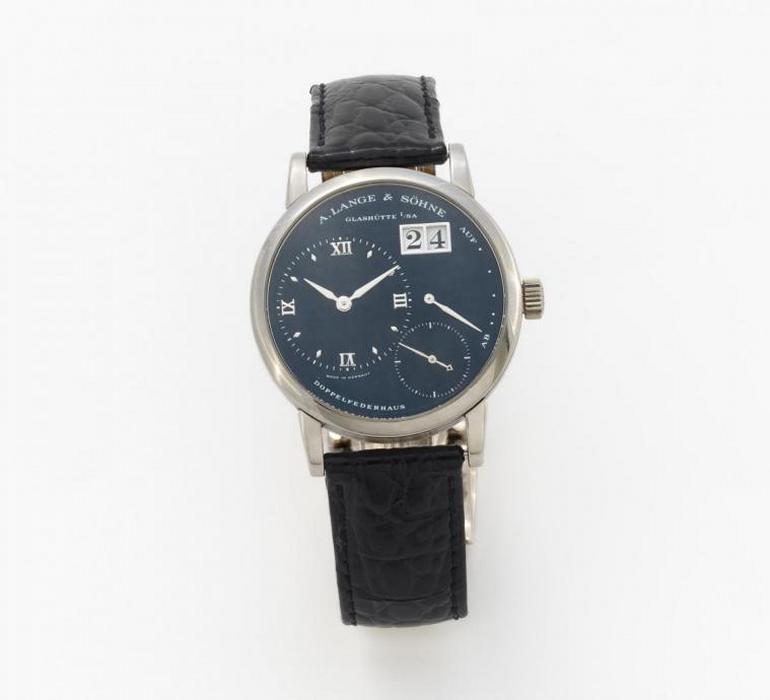 Kleine Lange 1. Herrenarmbanduhr. Gehäuse-Nr.: 119028. Referenz-Nr.: 111.035. Werk-Nr.: 15146. Gehäuse: 950/- Platin, Krokodillederarmband schwarz, Faltschließe Lange & Söhne 750/- Weißgold, Zffbl. blau, dez. Sekunde, Datumsanzeige, Automatik. Es handelt sich hierbei um eine Sonderanfertigung, das blaue Zifferblatt gehört nicht zum