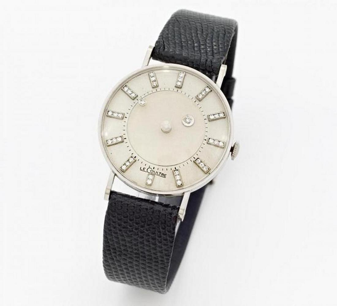 Mystery. Herren-/Damenarmbanduhr. Gehäuse: 585/- Weißgold, Lederarmband schwarz, Double-Dornschließe, Zffbl. silbern, Zeiger/Indizes diamantverziert, Handaufzug. D. 3,3cm, L. 23,0cm. Gewicht: 31,7g.