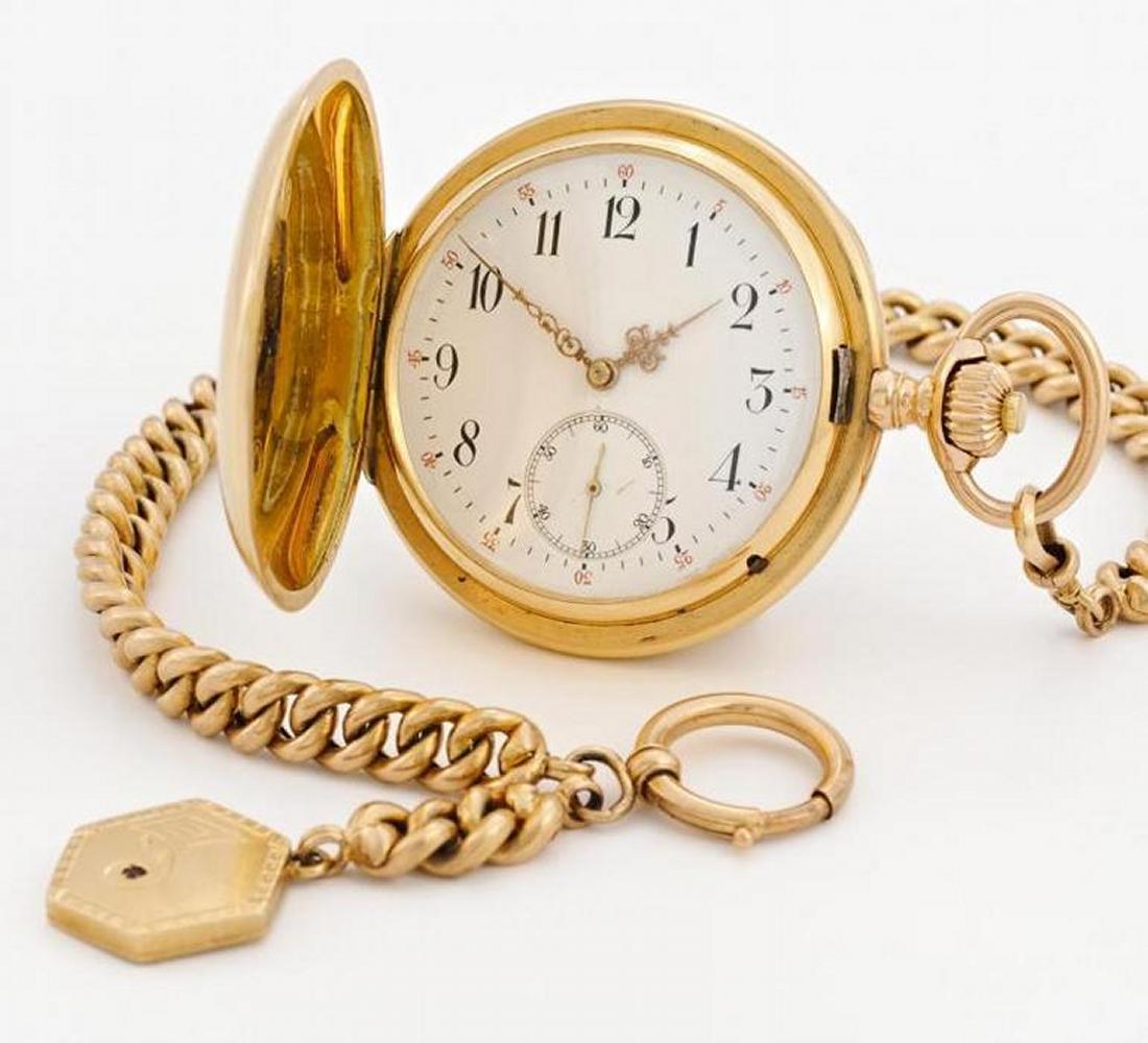 aufwändiges Monogramm "HA". Passende Kette anbei. D. 5,3cm, Uhrenkette ca. 32,0cm. Gewicht: Uhr 99,3g, Uhrenkette 30,1g, 580/- Roségold, Punze.