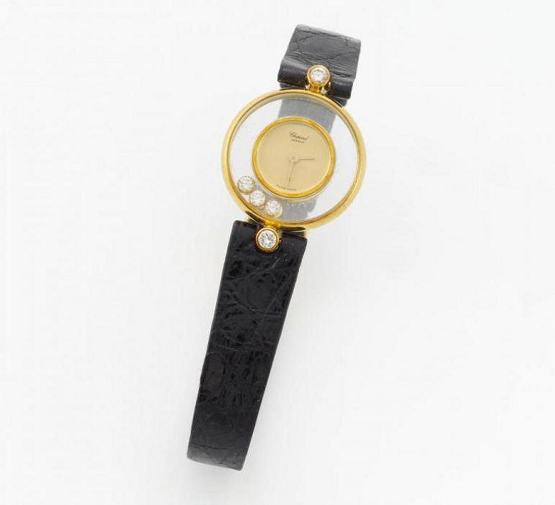 Happy Diamonds. Damenarmbanduhr. Gehäuse-Nr.: 214055. Referenz-Nr.: 3929. Gehäuse: 750/- Gelbgold, Lederarmband schwarz, Orig.-Dornschließe Plaque, Zffbl. golden, Zeiger golden, Quartz. In Orig.-Ledermappe inkl. Stift zur Zeiteinstellung. L. 19,5cm, D.ca. 21mm. Gewicht: 13,2g.