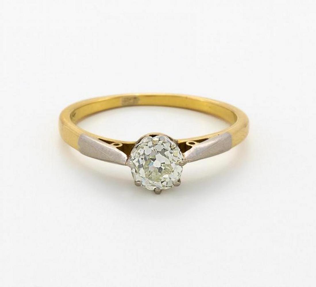 750/- Gelbgold, Platinverbödung, Gewicht: 2,8g. 1 Altschliff-Diamant ca. 0,605ct TCr(I)SI1, EU-RM: 55.
