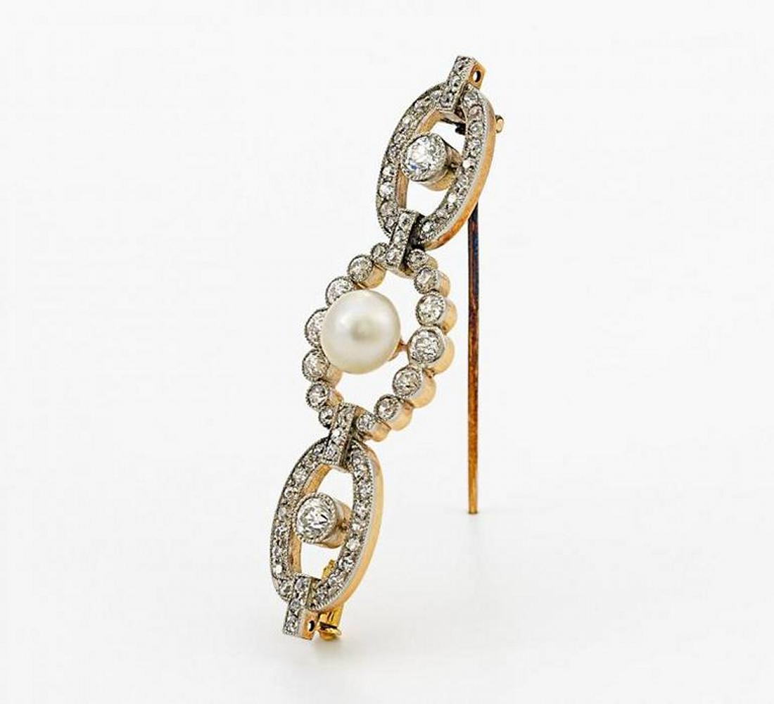 585/- Gelbgold, Weißgoldverbödung, Gewicht: 6,8g. Ca. 64 Altschliff-Diamanten zus.ca. 1,295ct TCr-Cr(I-J) VS, 1 vermutl. Naturperl-Bouton D.ca. 7,2 xmm, weiß-rosé,