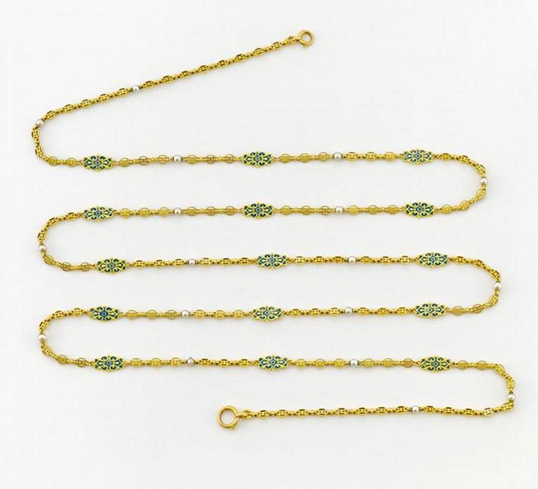 Historisches Sautoir mit Emaille-Naturperlbesatz.