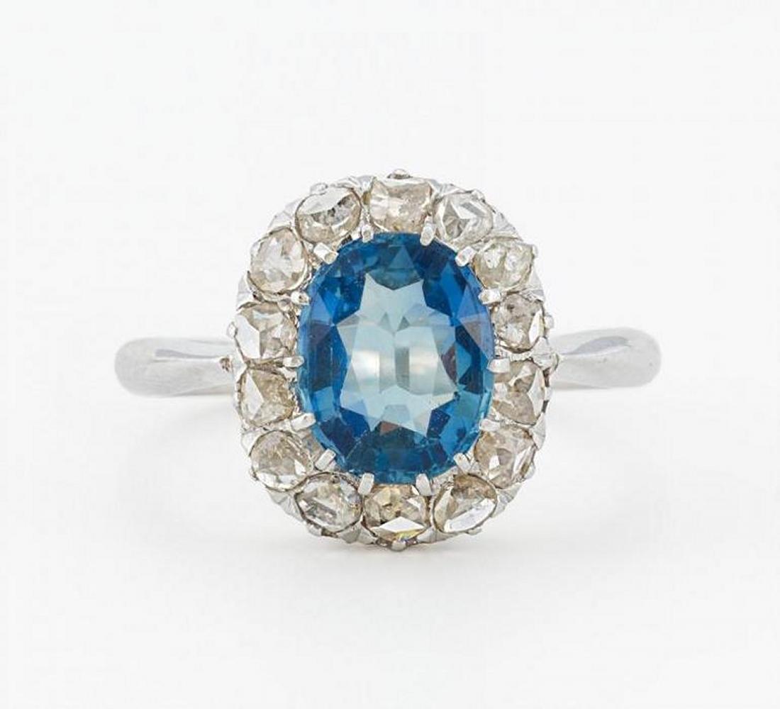 750/- Weißgold, Gewicht: 3,8g. 1 oval facettierter Saphir ca. 2,01ct, 15 Diamantrosen zus.ca. 0,315ct, EU-RM: 53.