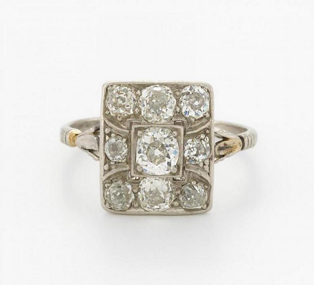 750/- Weißgold, Platinverbödung, Gewicht: 3,8g. 9 Altschliff-Diamanten zus.ca. 0,574ct TCr(I) SI, EU-RM: 53,5. Ringtop: D.ca. 1,3 x 1,1cm.