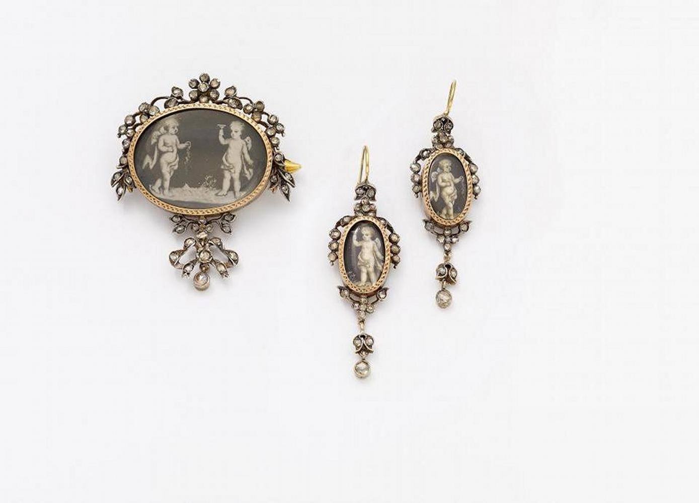 Rotgold, silbern, Email. 30,2g. Ca. 93 folierte Diamanten im Alt- und Rosenschliff (einer fehlend), Brosche: ca. 5,2 x 3,7cm, Ohrhänger: L. 5,6cm.~ Zarte Emailarbeit, rückseitige Glasabdeckung an Brosche. Frankreich, um 1880.