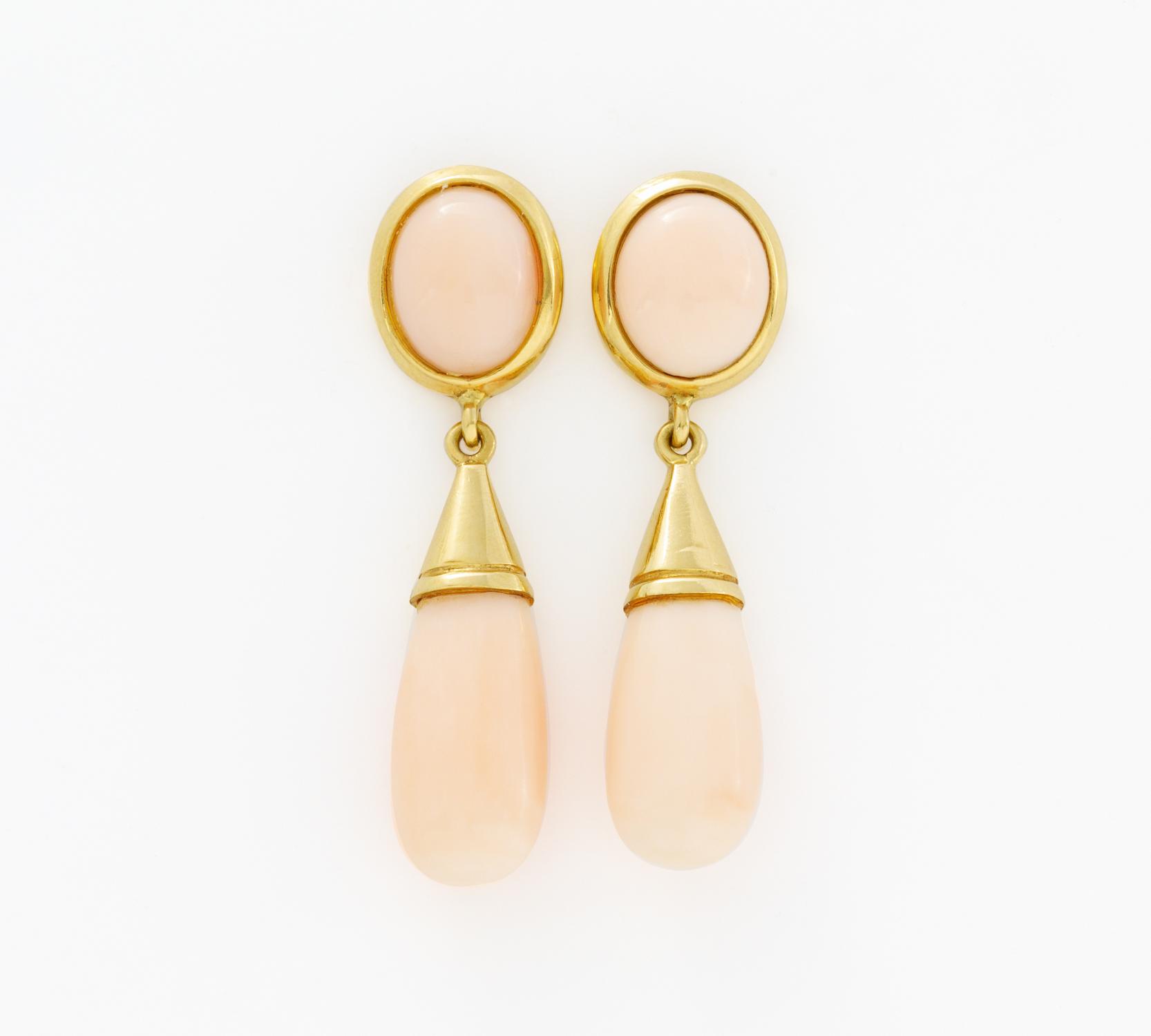 585/- Gelbgold. 9,2g. 2 Engelshautkorall-Pampeln D.ca. 16,5 x 9,0mm, 2 ovale Engelshautkorallen D.ca. 11,0 x 8,85mm. L. 4,2cm.~ Ohrmuttern fehlend.