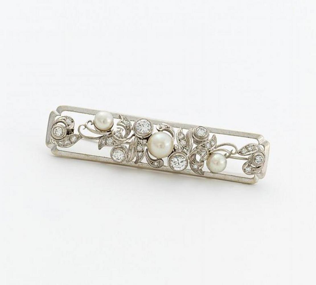 Florale Brosche mit Zuchtperl-Diamantbesatz.