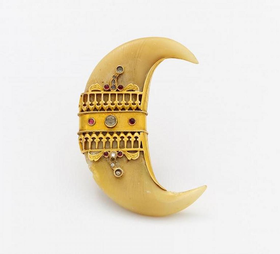 Broschierung: Goldfarben. 18,0g. 6 winzige pinkfarbene Farbsteine, 7 Simili-Steine (2 fehlend), 1 Raubtierkralle. H x B=ca. 6,3 x 2,2cm.~
