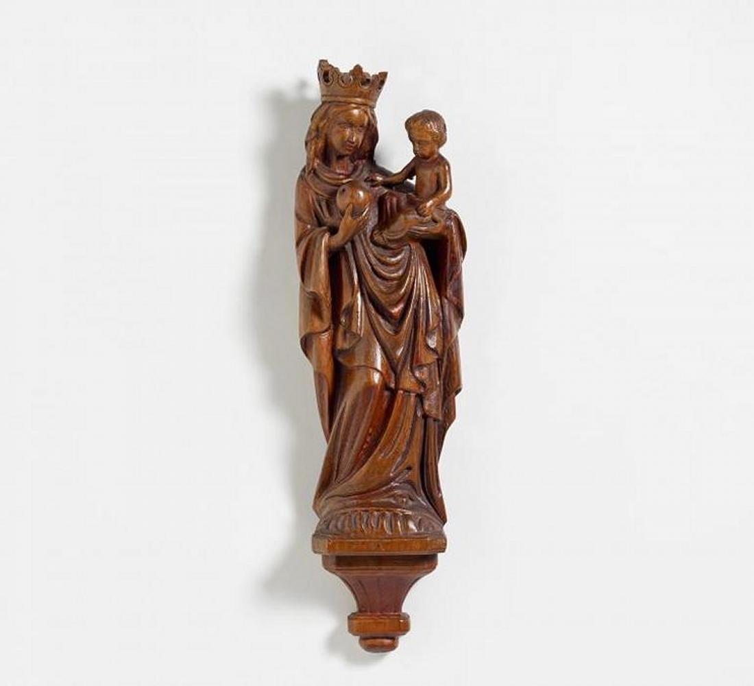 Madonna mit dem Christusknaben. Weichholz, ungefasst. Höhe: 70cm. Auf einer Konsole