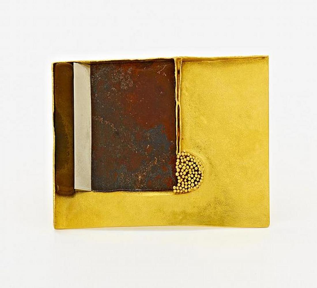 Gelbgold, Silber. 25,1g. 1 Schieferplatte, 1 bräunlicher Farbstein, H x B=ca. 4,5 x 6,0cm.~ Broschierung leicht verbogen. Rückseitig sign. REISTER´70.