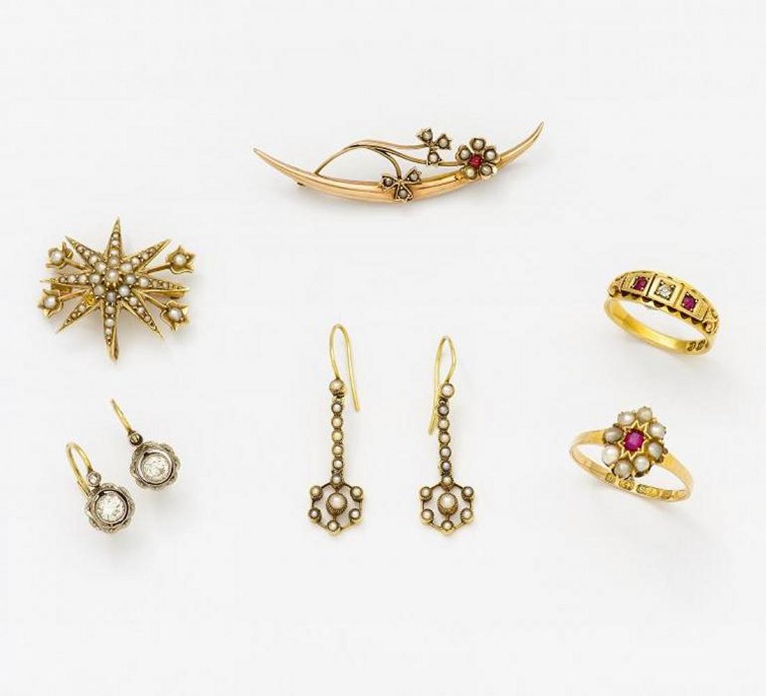 Ring: 750/- GG; gest.; Ring: 625/- GG, gest.; Ohrgehänge: 625/- GG, gest.; Ohrgehänge: Goldfarben, Brosche: 375/- Rotgold, gest.; Brosche: Goldfarben. 2,5g; 1,8g; 1,9g; 2,1g; 1,7g; 2,2g. 4 facettierte Rubine, 3 Diamanten, 1 winziger Diamant, ca. 80 Saatperlen (eine fehlend). EU-RM: 50; 57,5. England, um 1860/80.