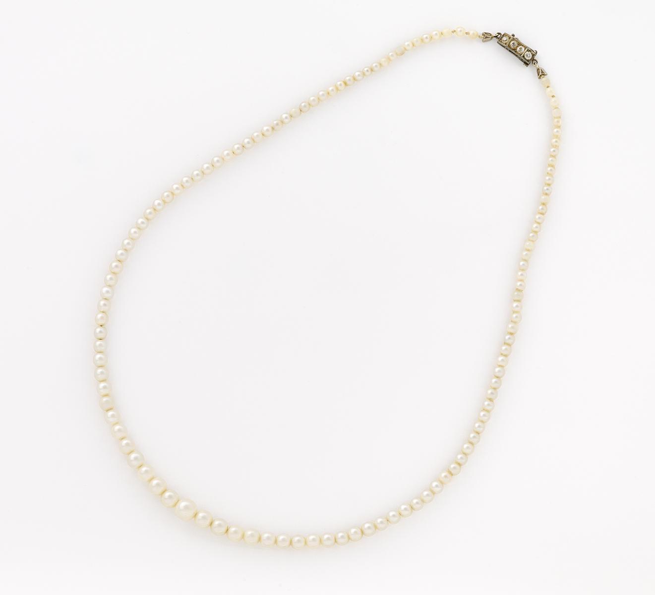 Silbern. 14,2g. 3 Altschliff-Diamanten, 117 Süßwasser-Zuchtperlen im Verlauf, leicht unrund-rund, weiß-leicht creme-silbern, D.ca. 2,95-6,86mm. L. 48,0cm.~