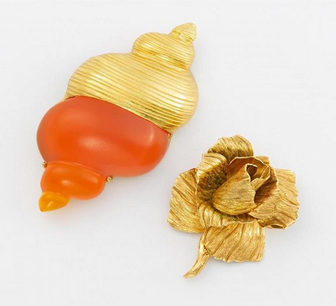 Metall/ vergoldet. Total: 112,2g. Apricotfarbener Farbstein, Rose: D.ca. 6,0 x 3,6cm, Muschel: D.ca. 9,6 x 5,0cm.~ Muschel sign. Christian Dior Parfums, Rose sign. Chr. Dior Germany. Um 1940/50.
