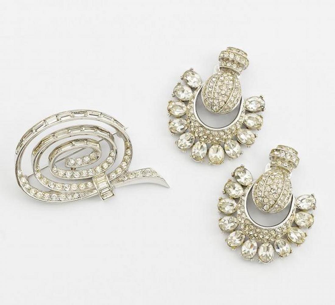 Metall/versilbert. 15,2g. Vielzählige Strasssteine, L x B=4,0 x 3,5cm.~ Sign. BOUCHER 5579. Beilage: Ohrclipgehänge, Metall/versilbert, ca. 36,4g, vielzählige