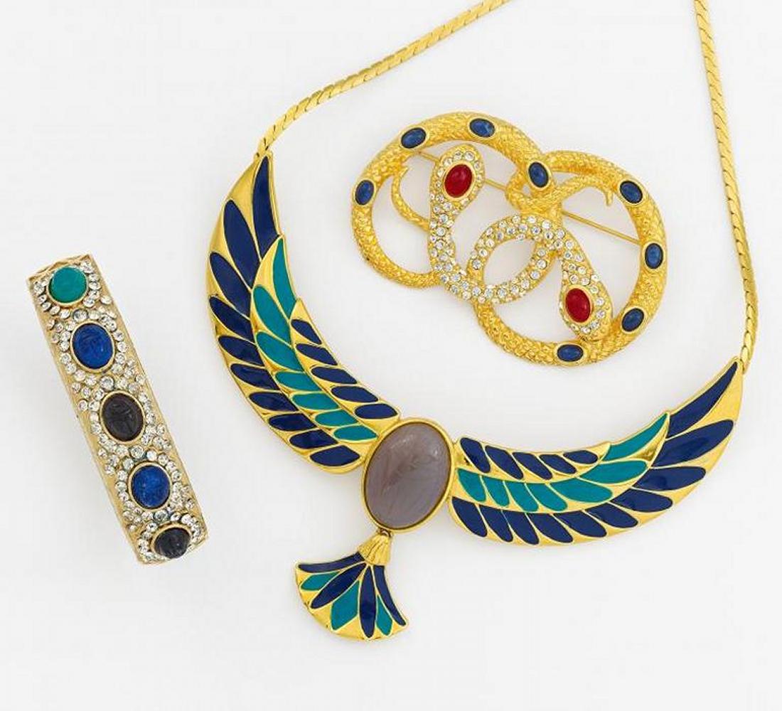 Metall/vergoldet, farbiges Email. 155,2g. Grüne/blaue und schwarz geschnitzte Glassteine, Vielzählige Strasssteine, L. ca. 38,0cm, Innendurchmesser: D.ca. 6,0 x 5,1cm.~ Collier: The Franklin Mint Collier "Jewel of the Nile" in Etui. Beilage: Brosche mit