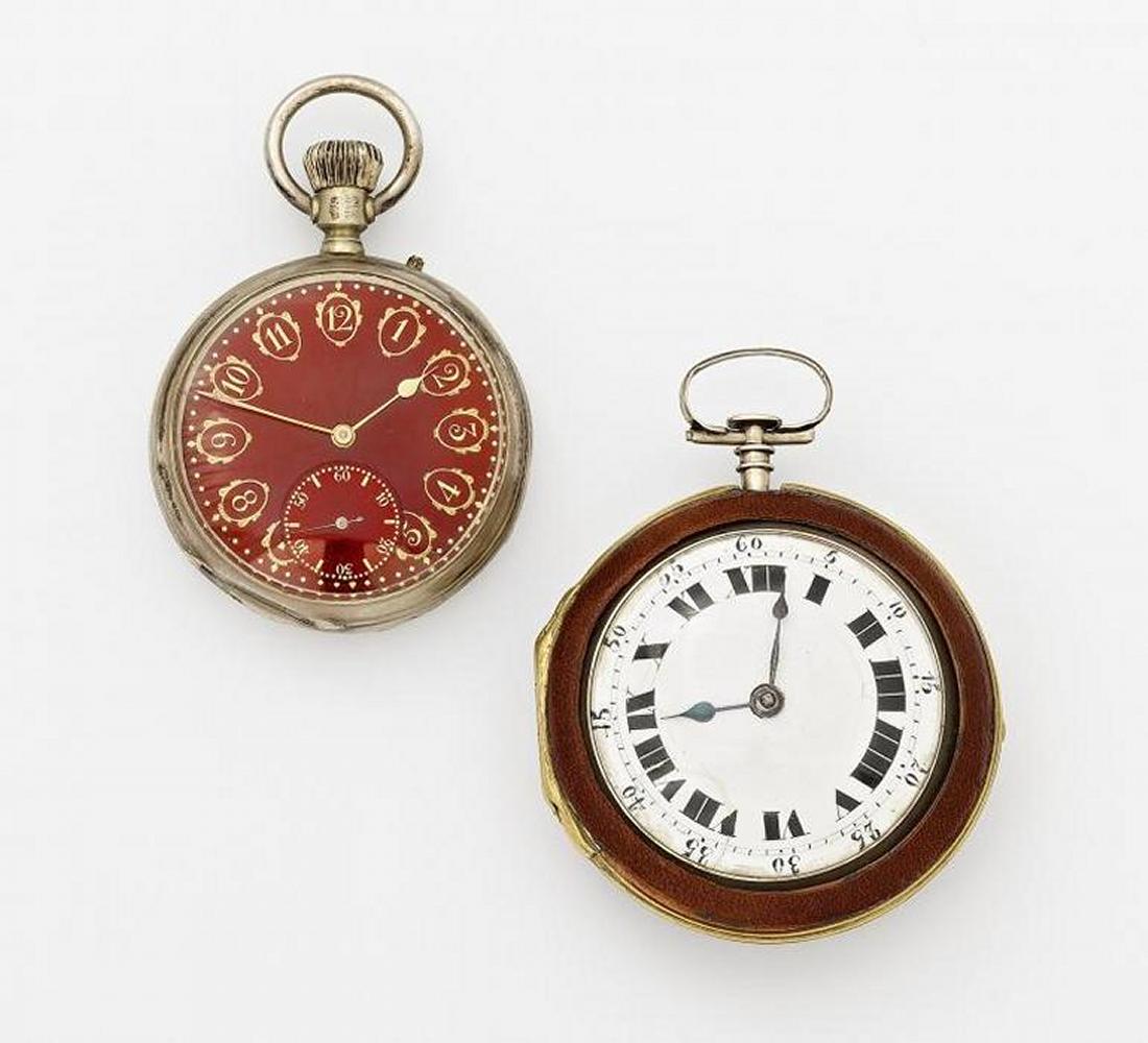 Unsigniert. Gehäuse: Silber, Zffbl. Email/ rot guillochiert, Ziffern schwarz/golden, Schlüssel-/Handaufzug. D.ca. 4,7cm, Übergehäuse: D.ca. 5,6cm. Gewicht: Total: 152,2g (ohne Übergehäuse).