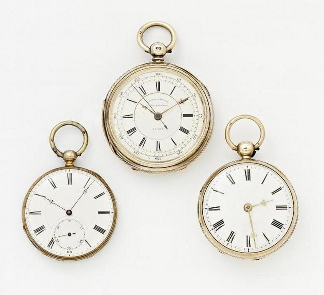 Centre Seconds Chronograph, u.A. Gehäuse: Silbern, Zffbl. Email, Ziffern schwarz, Schlüsselaufzug. D.ca. 57-48mm. Gewicht: Total: 424,2g.