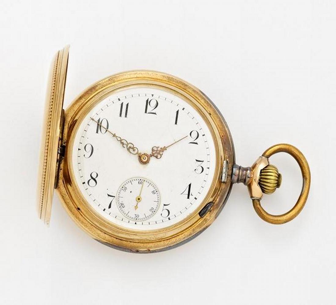 Gehäuse-Nr.: 56362. Gehäuse: 585/- Gelbgold, gestempelt, Zffbl. Email, Ziffern schwarz, dez. Sekunde, Handaufzug. Vorderseitiges Monogramm MI, Innendeckel 585/- Gelbgold, gestempelt. D.ca. 5,0cm. Gewicht: 87,2g.