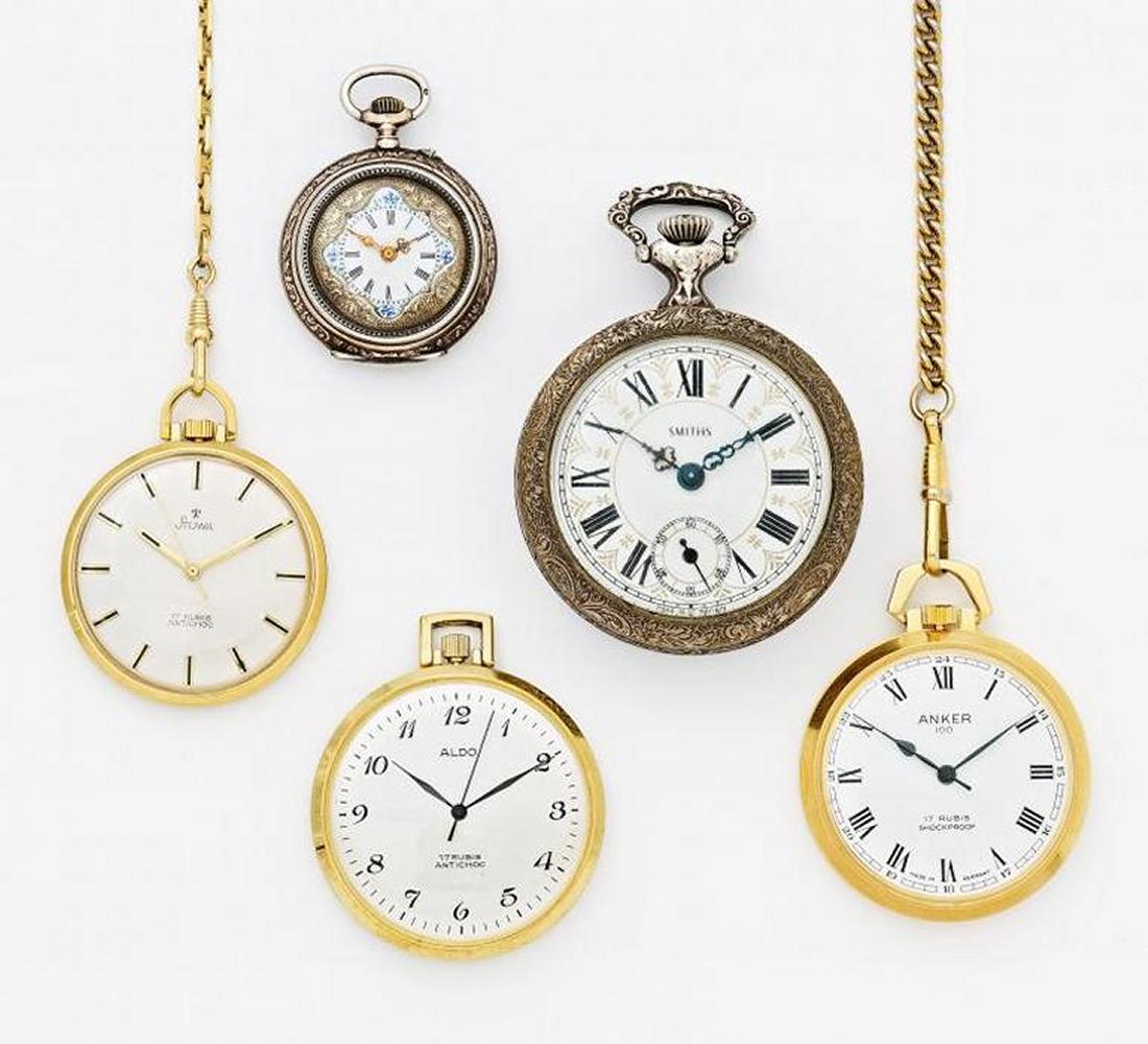 Aldo, Anker, Smiths, Stowa, unsign. Gehäuse: Stahl/vergoldet, silbern, Zffbl. silbern/weiß, Email, Ziffern schwarz/bedruckt, Handaufzug. Inkl. zwei unedler Uhrenketten. D.ca. 50-31mm. Gewicht: Total: 283,2g.