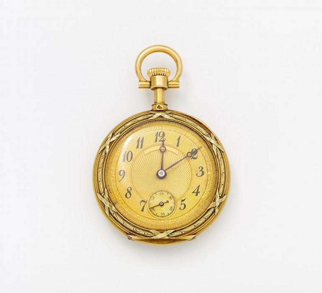 Gehäuse: Gelbgold, Zffbl. golden, Zeiger gebläut, Handaufzug. Rückseite diamantgeziert. D.ca. 3,1cm. Gewicht: 25,4g.