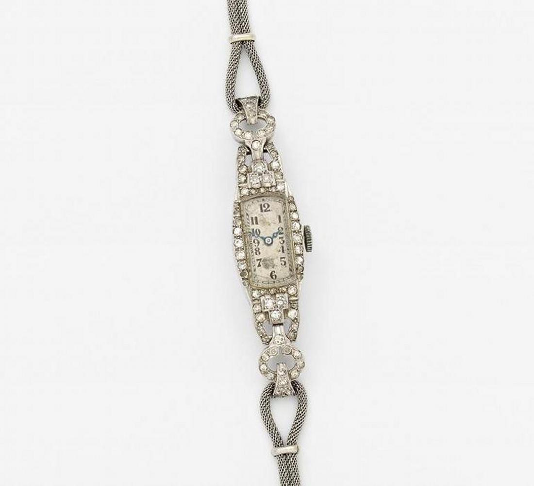 Gehäuse-Nr.: 5125. Gehäuse: Platin, Zffbl. silbern, Ziffern schwarz, Handaufzug. Diamantgezierte Lünette und Bandanstöße. L. 18,5cm, D.ca. 2,2 x 1,8cm. Gewicht: 23,6g. Um 1920.~