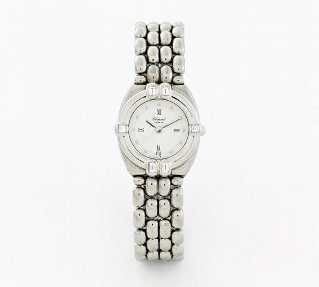Gstaad. Damenarmbanduhr. Gehäuse-Nr.: GD15760. Referenz-Nr.: 8112. Gehäuse: Edelstahl, Zffbl. weiß, silberne Zeiger, Datumsanzeige, Quartz. Lünette, diamantverziert. L. 19,0cm, D. 2,3cm. Gewicht: 55,6g.