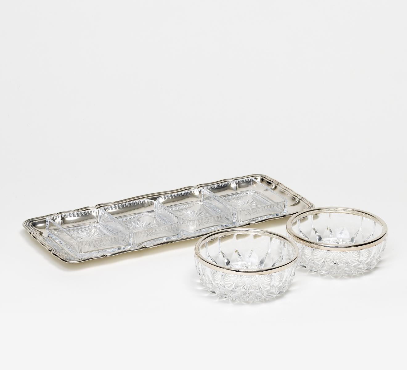Anbietplatte mit Kristallschälchen und zwei Schalen.