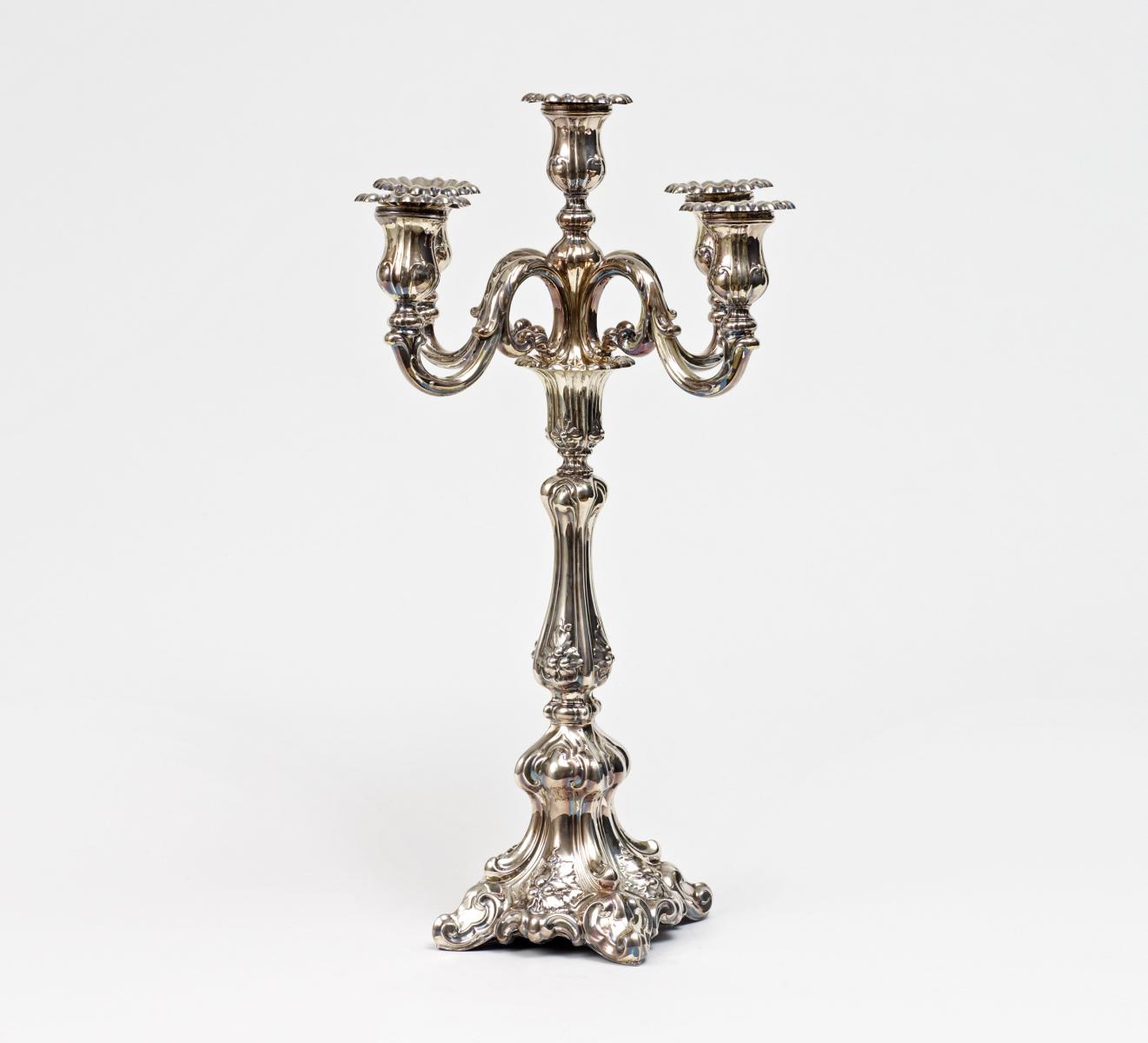 Silber. Fuß gefüllt. Fünfflammig. H.55,5cm. Leuchtereinsatz ca.668g. Zustand A/B. Zaponiert.