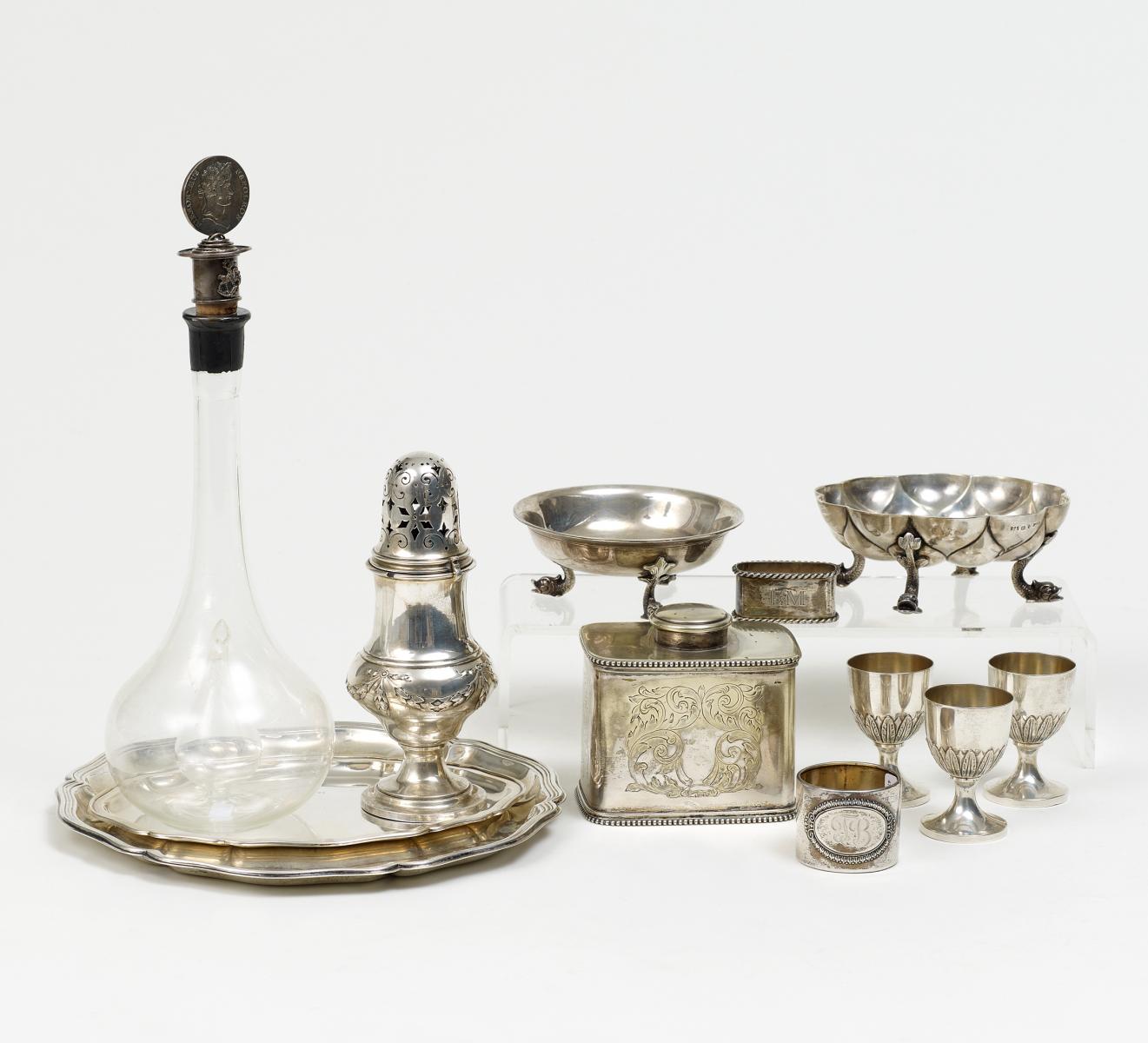 Silber. Einmal Glas. Bestehend aus: 2 Untersetzern, 2 Gebäckschälchen, 2 Serviettenringen, 3 Eierbechern,