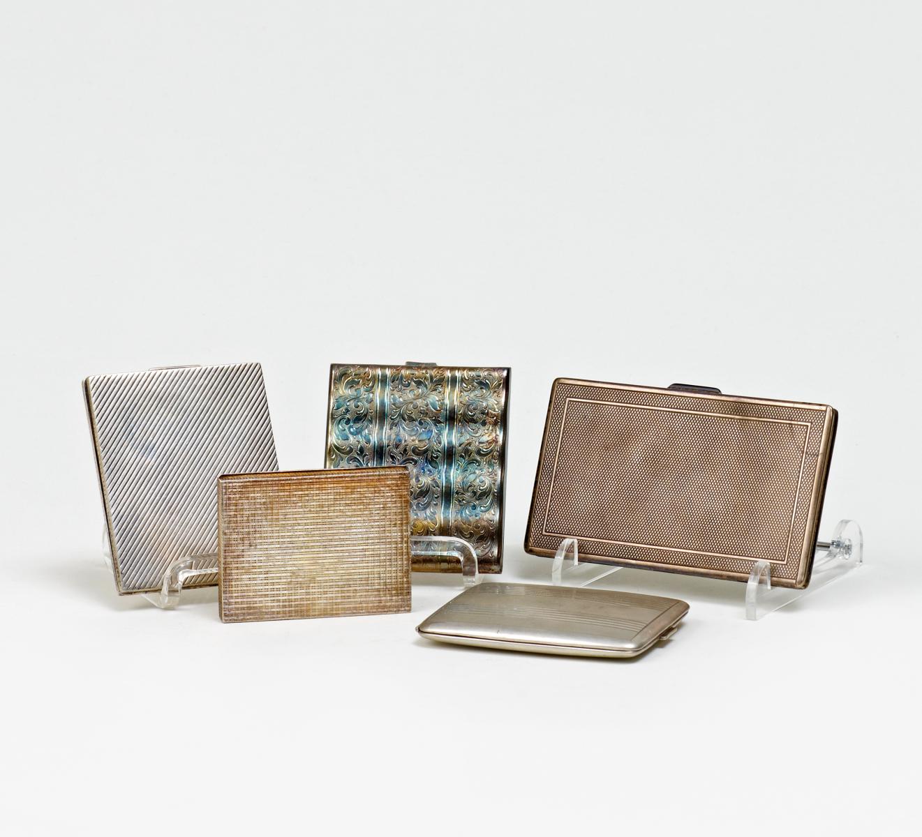 Silber. Best. aus: 3 Zigaretten-, Zigarilloetuis, 1 Visitenkartenetui. {Beil.:} Zigarettenetui. Ca. 548g. Zustand A/B-B.