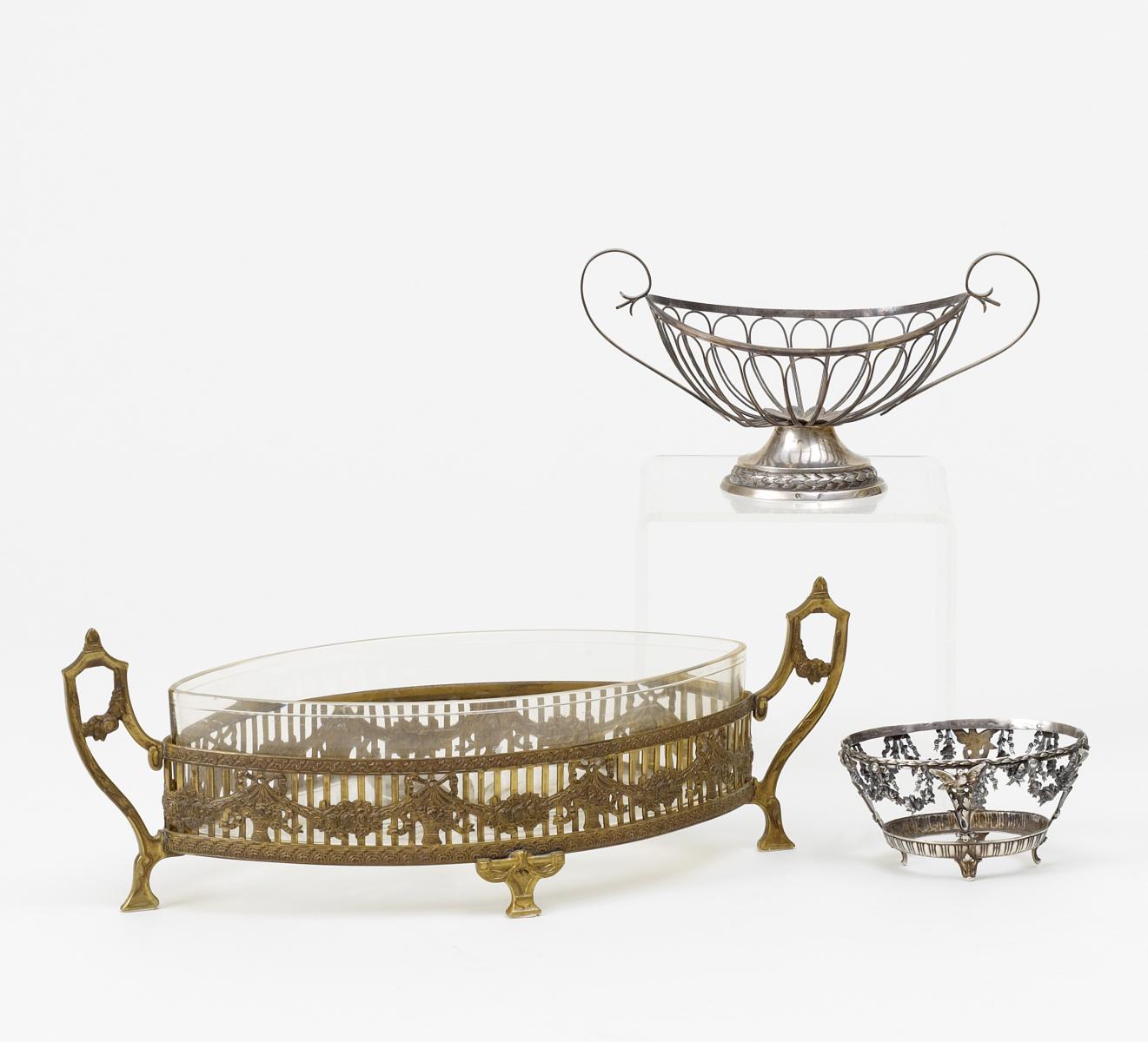 Silber. {Beil.:} Jardiniere. Messing mit Glaseinsatz. H.11,5 / 6cm. Ca.238g. Zustand B-B/C.