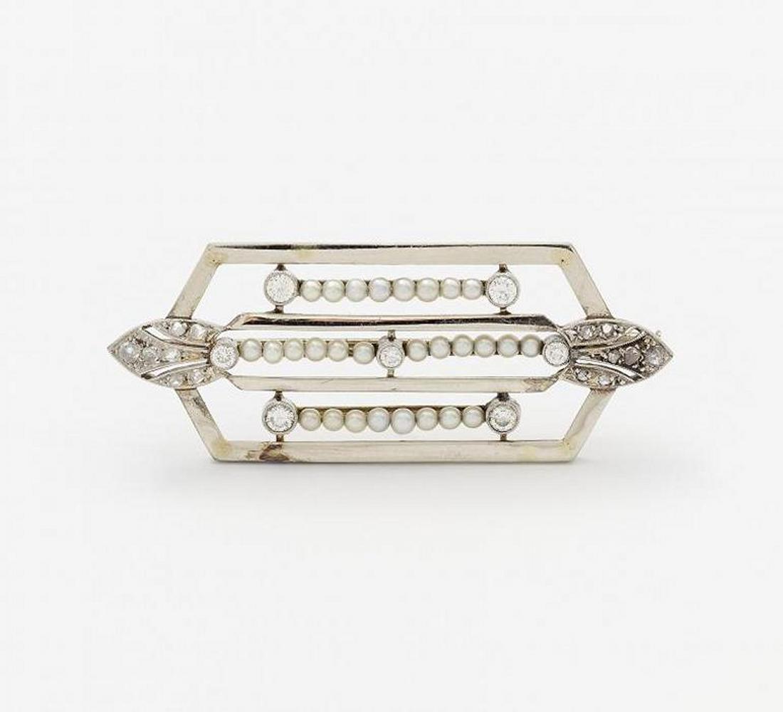 Art Deco. Brosche mit Diamant-Perlbesatz.