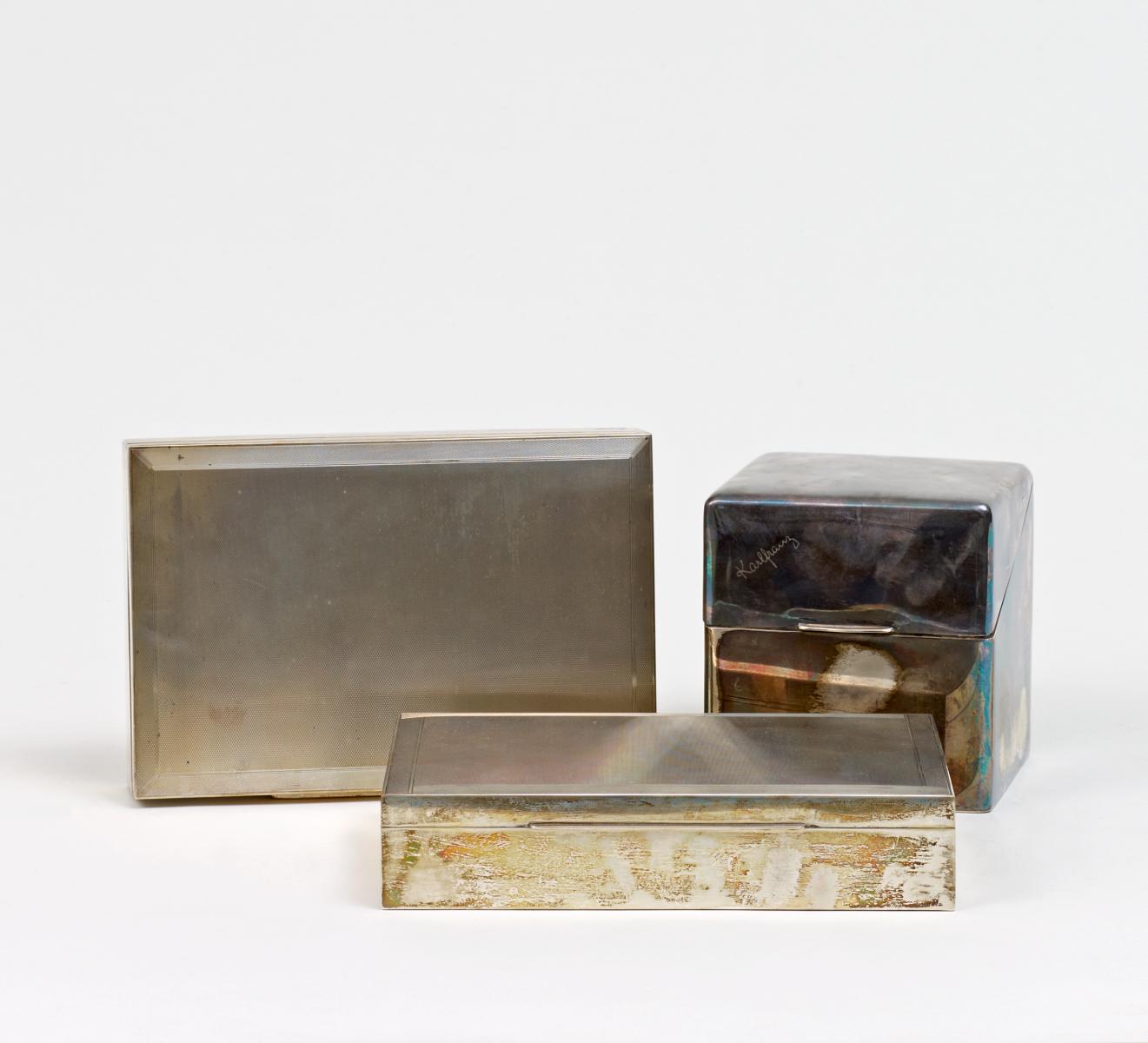 Silber, Holzkern. 13,5x12,5x12,5 / 4,5x22,5x15,5 / 4,5x22,5x15,5cm. Zustand A/B.