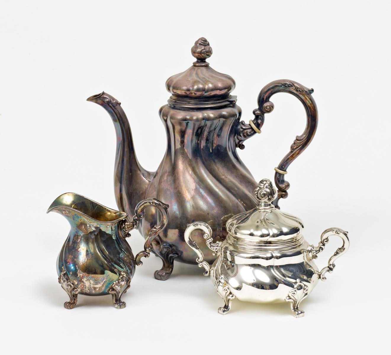 Silber, zweimal Innenvergoldung. Insg. drei Teile, best. aus Kaffeekanne, Milchkännchen, Zuckerdose. Ca.1188g. Zustand A/B-B.