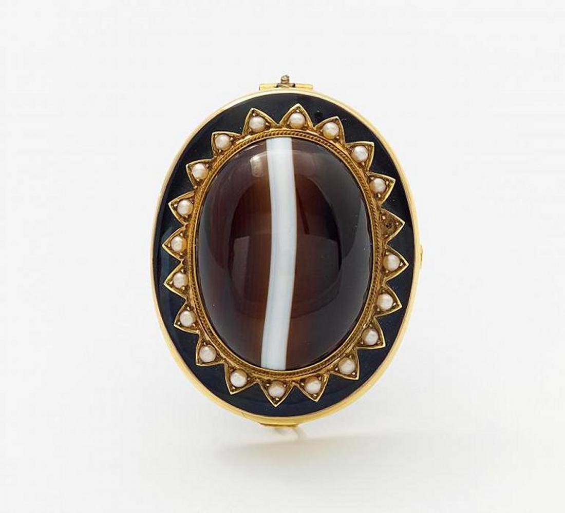 Goldfarben, Email. 21,2g. 1 ovaler Achat-Cabochon, 19 winzige Saatperlen (eine fehlend). D.ca. 4,4 x 3,5cm.~ Rückseitige Glasabdeckung für Haareinlage o.Ä. vorhanden, Italien um 1860.