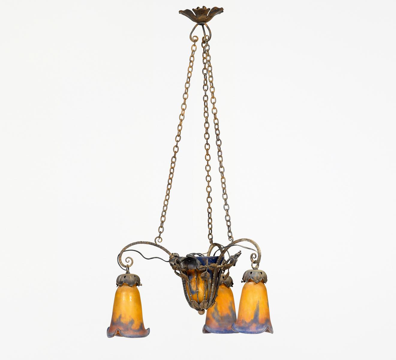 Farbloses Glas mit orangefarbenen und blauen Pulvereinschmelzungen. H.87cm. Zustand B. Elektrifiziert.