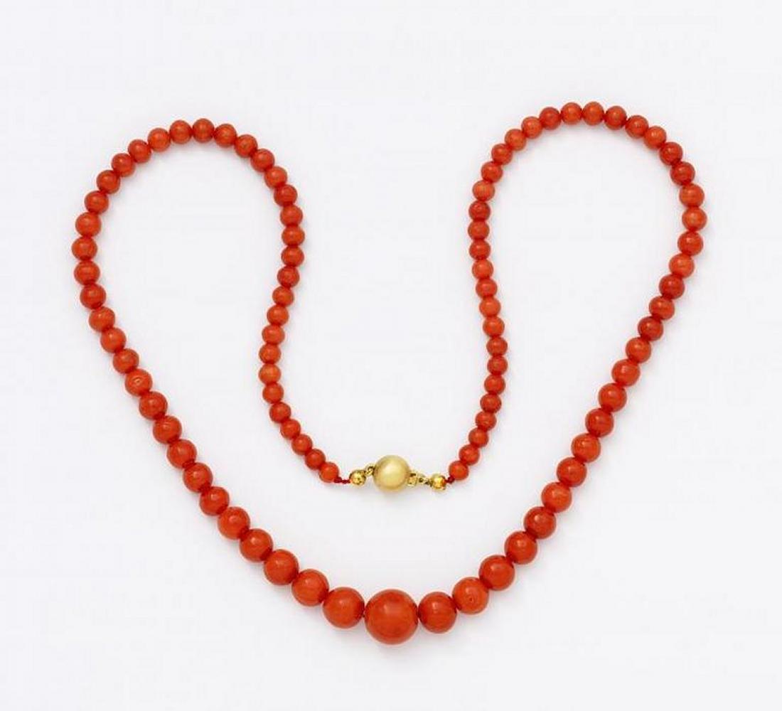 Verschluss: 585/- Gelbgold, gestempelt. 26,2g. Ca. 93 Korallperlen, D. 12,0-4,0mm. L. 49,5cm.~